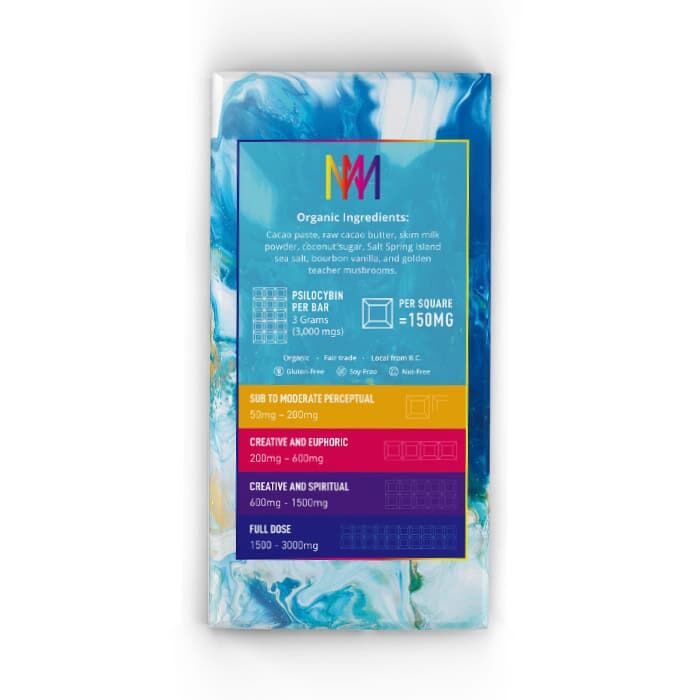 Each bar contains 3000mgs of psilocybin mushrooms per bar. Each square of chocolate is dosed at 150mgs per square and a total of 20 squares.